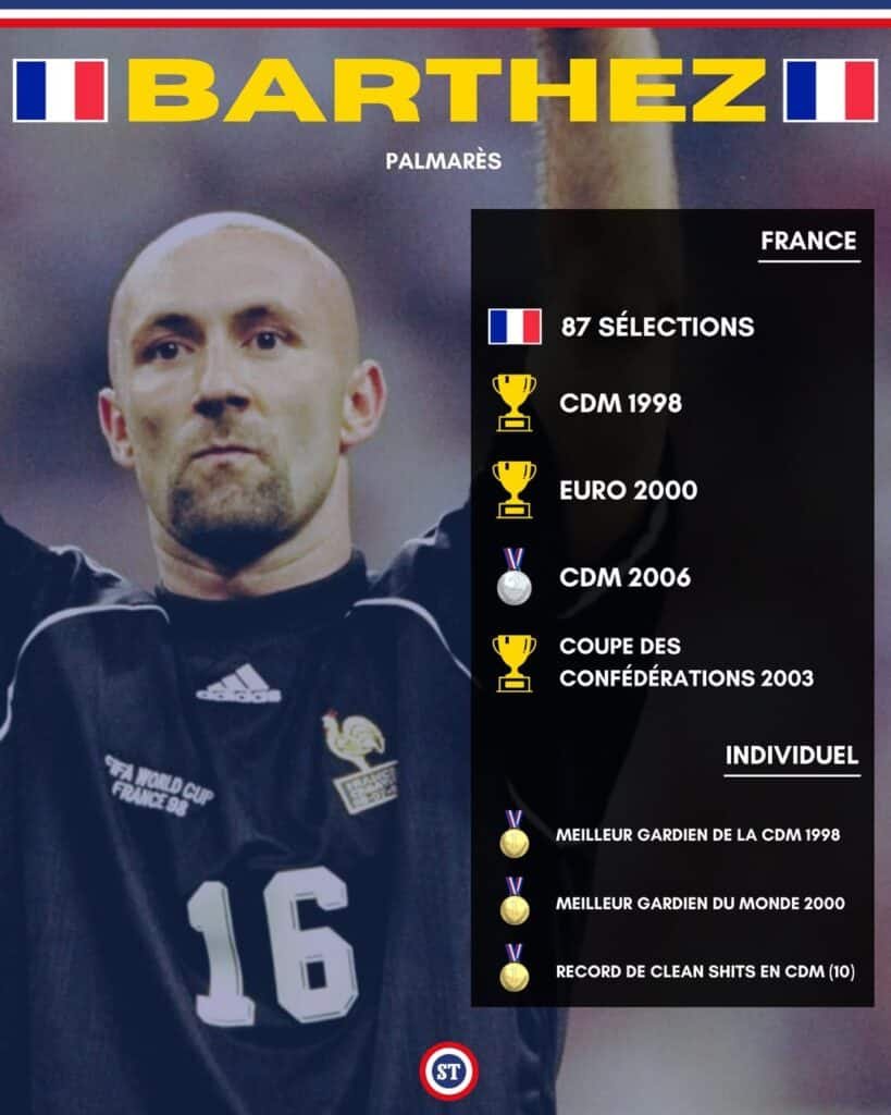Il reste, à ce jour, le seul gardien français à avoir décroché les trois principaux trophées du football mondial. La Ligue des champions avec l’Olympique de Marseille en 1993, la Coupe du monde avec l’équipe de France en 1998, l’Euro deux ans plus tard en 2000 : Fabien Barthez a tout gagné dans les cages, à une époque où la France dominait le football européen et mondial. Formé au Toulouse FC, il a ensuite brillé à Monaco, à Manchester United où il remporta deux titres de champion d’Angleterre en 2001 et 2003 et fut élu meilleur gardien de Premier League, avant un retour à Marseille et une fin de carrière difficile à Nantes. En 87 sélections sous le maillot bleu, il est devenu co-recordman du nombre de clean sheets en Coupe du monde, aux côtés de l’Anglais Peter Shilton.